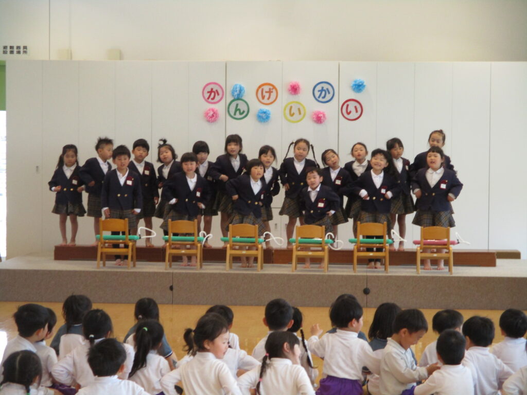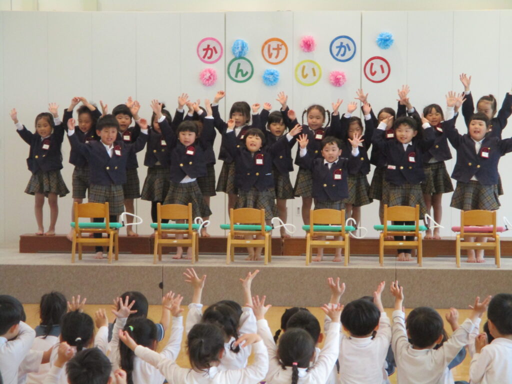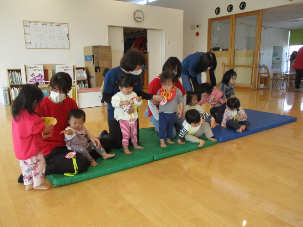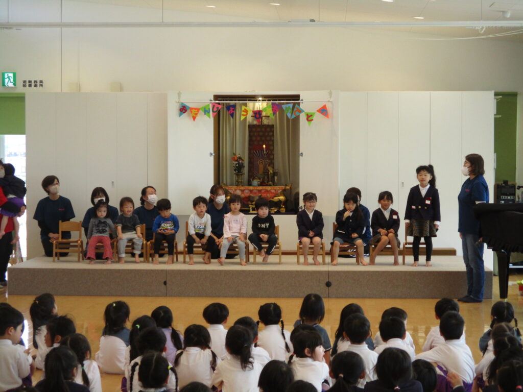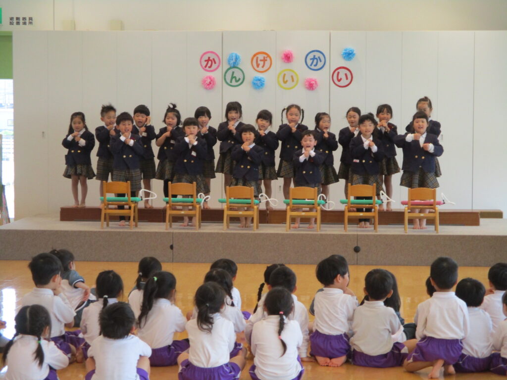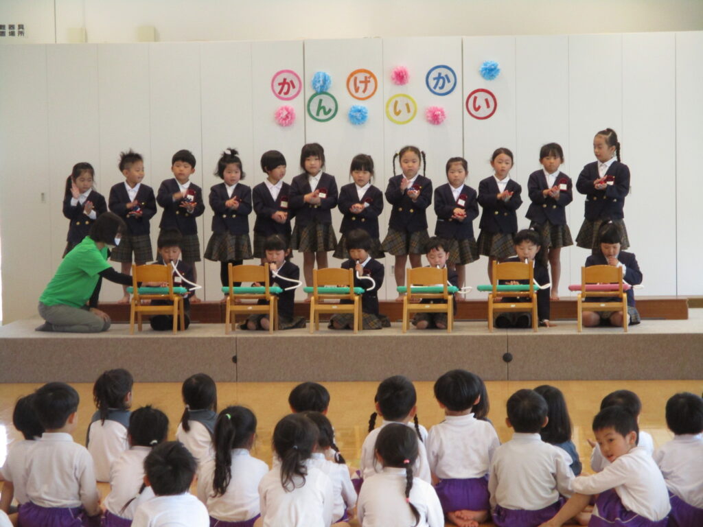今月の催しは昨年度途中入園のお友達と今年度入園したお友達の歓迎会として、年長児はす組さんが手遊び・歌・合奏を披露してくれました。