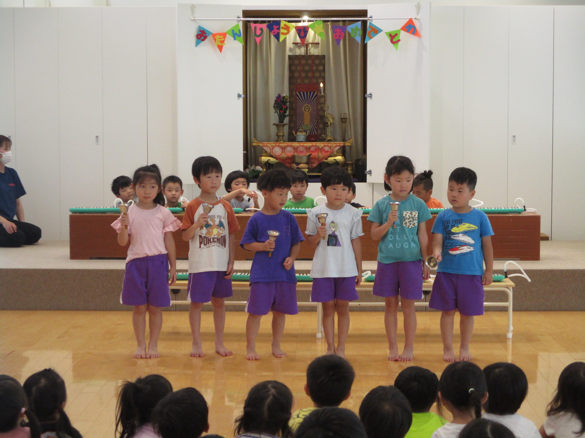 2025.07.142025.09.25保育の様子 7月 おたんじょう会 7月生まれのお友だち、先生、おめでとうございます! お楽しみの催しで、年長児はすぐみさんによる「きらきら星」の演奏がありました。 日ごろの音楽教室の取り組みもあり、ミュージックベルと鍵盤ハーモニカの演奏がとても上手で素敵でした。 そして~、職員による「たなばたのげき」を行いました。 織姫、彦星、神様が登場し、七夕の由来のお話しを、子どもたちは一生懸命見ていました。